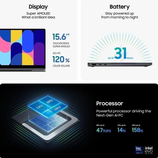 Display: 39.62 cm (15.6-inch) FHD (1920 x 1080) AMOLED Touchscreen, with S Pen support.